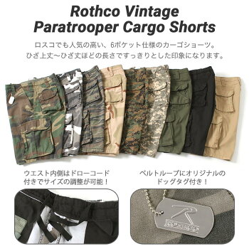 ブランド名:ロスコ|ROTHCOシリーズ名:Rothco Vintage Paratrooper Cargo Shortsサイズ:【USA規格】XS・S・M・L・XL・2XLカラー:ウッドランド(2140)・タイガーストライプ(2635)・ウッドランドDIGITAL(2591)・アーミーDIGITAL(2531)・シティ(2155)・トリカラーデザート(2150)・ブラック(2130)・カーキ(2170)・オリーブDRAB(2160)素材:コットン55% ポリエステル45%|ツイル生地|ストーンウォッシュ加工厚み:やや薄手仕様:ジッパーフライ仕様|ウエストにドローコード|ドッグタグ付き|裾部分にドローコード伸縮性:なし透け感:なし生産国:中国製…他ABOUT THE BRANDブランド説明「ROTHCO|ロスコ」|60年以上の歴史を持つアメリカを代表するミリタリーウェアブランドCOMBAT TESTED SINCE 1953 ROTHCO1953年にアメリカ東海岸のマンハッタンでMilton Somberg (ミルトン・ソンバーグ)によって設立されたROTHCOは、 創立した当初よりアメリカの陸海軍に ミリタリー製品を供給してきた伝統あるミリタリーウエアブランド。