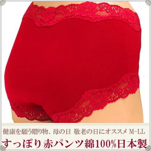 赤いショーツ 綿100% 日本製 健康を願う赤パンツ コットン 母の日・敬老の日の贈り物 レディース 女性 赤い下着 還暦 丹田 赤パンツ お腹すっぽりショーツ お尻すっぽり 綿100% 赤いショーツ 日本製 赤い下着 レディース M L LL 大きいサイズ 綿100%赤いパンツ 女性 還暦祝い あったか 母 暖かい食い込まないショーツ 贅沢レースの赤いショーツ 100円(税別) 袋ラッピング ギフトにおすすめのラッピングは⇒こちらから選ぶことができます。